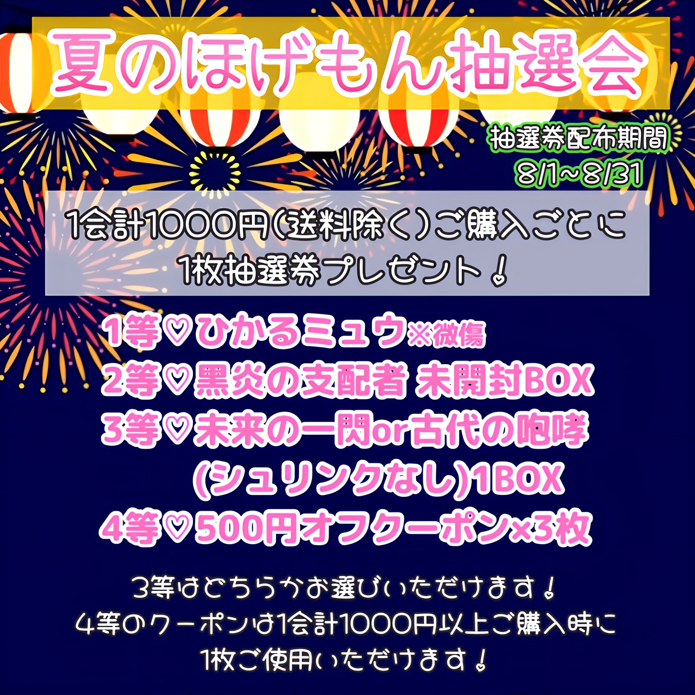 8/31まで1000円(送料除く)ご購入ごとに1枚ほげもん抽選会の抽選券配布中✨
